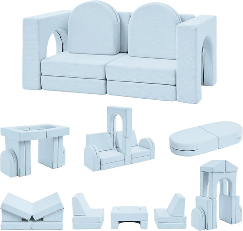 10PCS Toddler Couch, 10-in-1 Multifunctional Kids Sofa for Playroom, Corduroy Light Blue